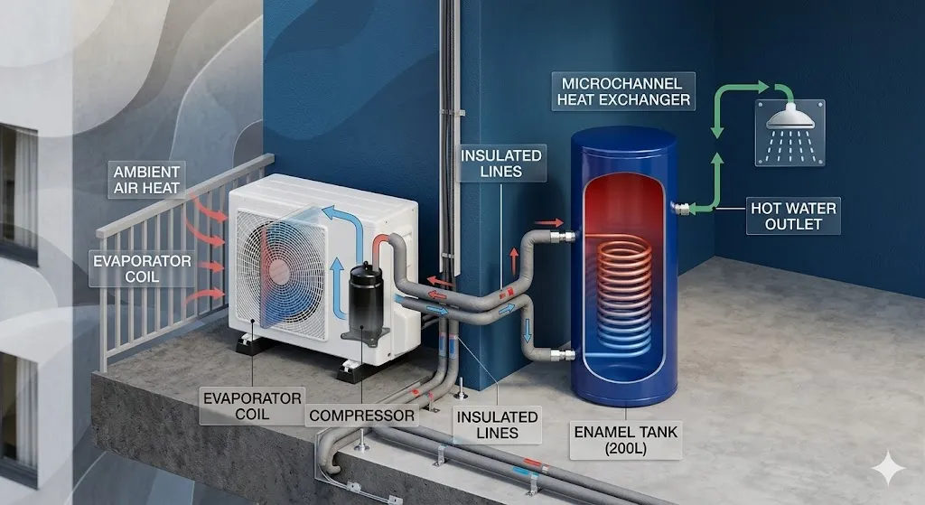 Quá trình này vận hành tương tự như một chiếc điều hòa nhiệt độ chạy ở chế độ sưởi nhưng đích đến của nhiệt lượng là nguồn nước trong bình chứa.
